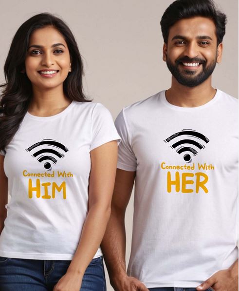 We use DTG Technology to print Connect with Her Him Wifi Couple T-shirt thd.