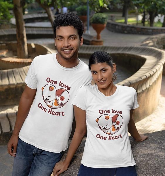 We use DTG Technology to print One Love One Heart Couple T-Shirts thd.